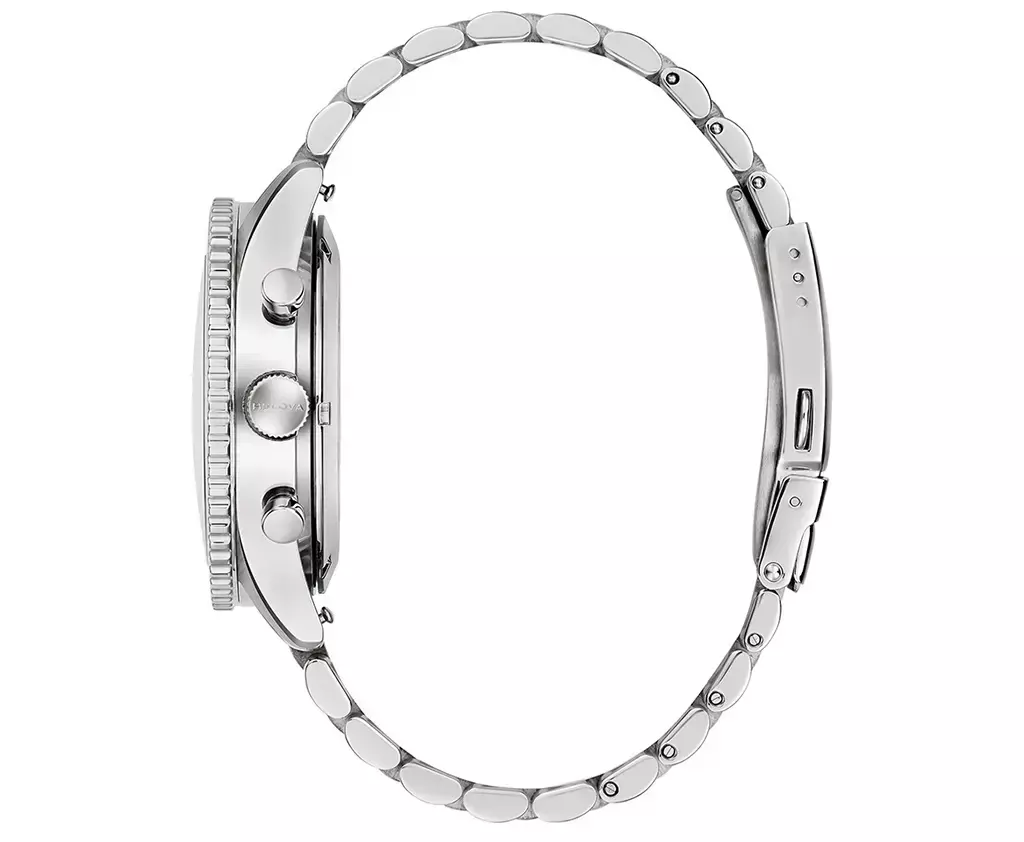 Descripcion:Este cronógrafo de edición especial celebra una de las colecciones más icónicas de Bulova en su 150 aniversario. La caja de acero inoxidable en tono plateado tiene un diseño que equilibra forma y función . La esfera negra muestra el logotipo vintage de Marine Star, agujas plateadas y números blancos con relleno súper luminoso, una pantalla de fecha y subesferas, incluidos registros que permiten cronometrar hasta 1/20 de segundo y están terminadas con un cristal de zafiro de doble cúpula. Este reloj de colección está equipado con nuestro movimiento patentado Precisionist, que resuena a una frecuencia de 262 kHz para una precisión incomparable.